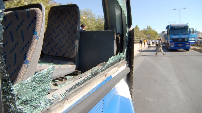 Από τις πέτρες έσπασαν τα μεσαία τζάμια του λεωφορείου, με τα θραύσματα να πέφτουν στο εσωτερικό του οχήματος