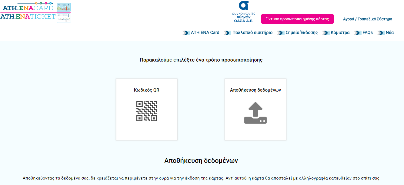 Η αίτηση γίνεται μέσω της σελίδας athenacard.gr, πατώντας στον σύνδεσμο “Έντυπο προσωποποιημένης κάρτας”. Στη συνέχεια, επιλέγετε “Αποθήκευση δεδομένων”, δεξιά. (Αν θέλετε να ακολουθήσετε την παλιά διαδικασία, με έκδοση της κάρτας σας σε εκδοτήριο, επιλέγετε “Κωδικός QR”).
